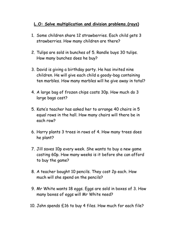 In year 2, children will solve multiplication and division problems using the 2, 5, and 10 times tables multiplication and division word problem. Multiplication and division word problems by teachernela.